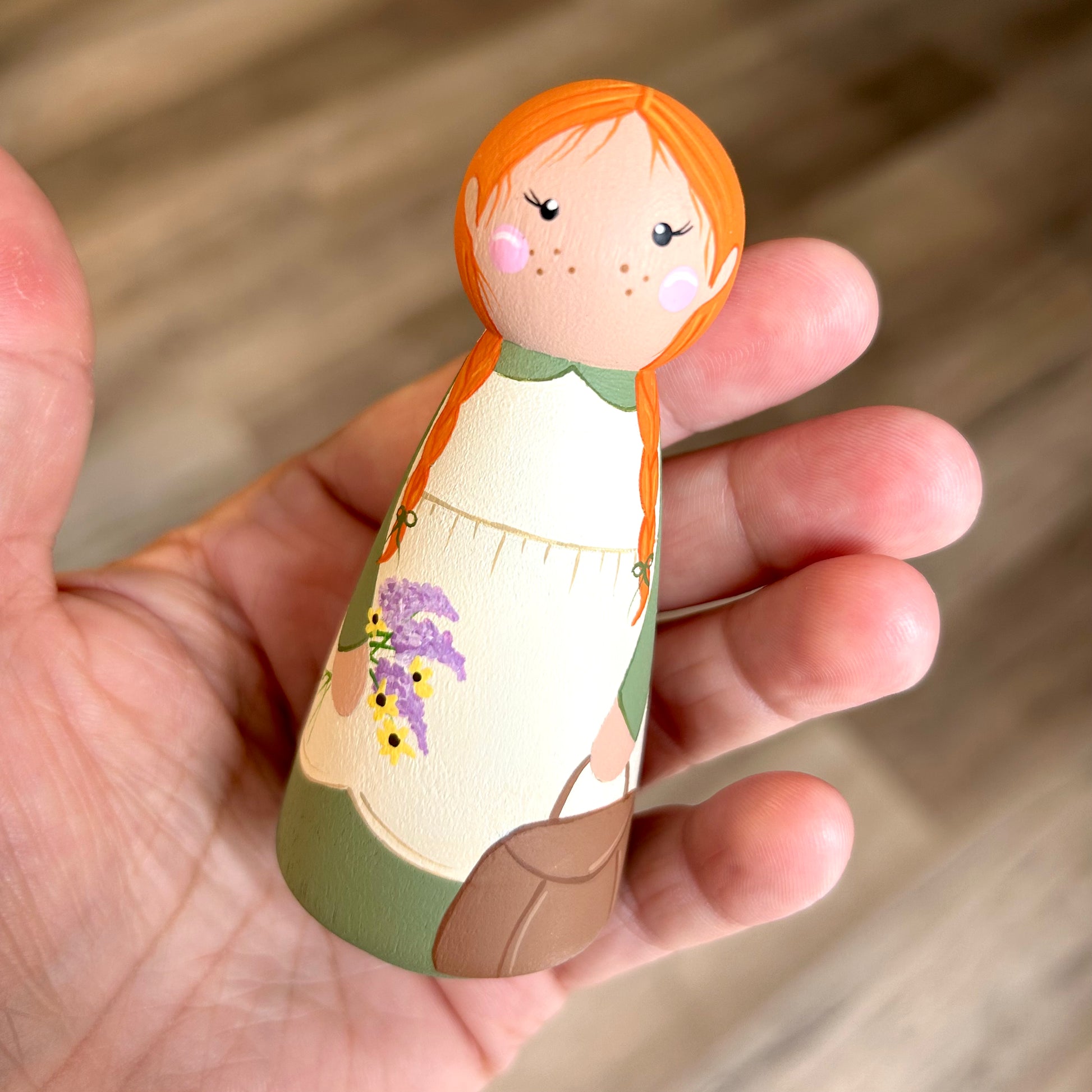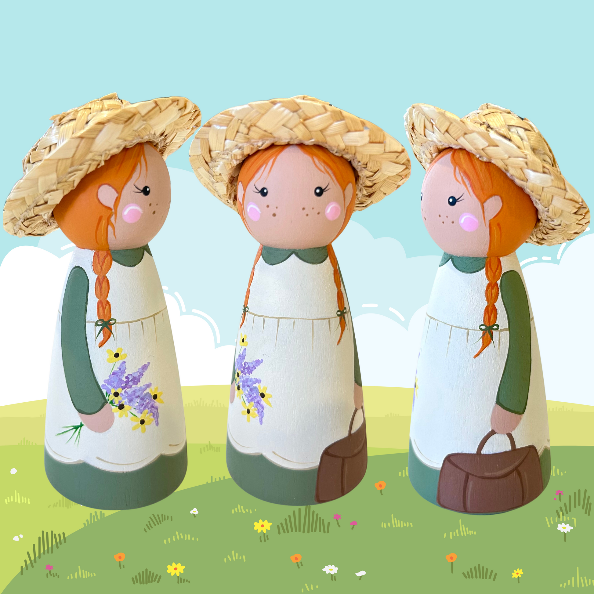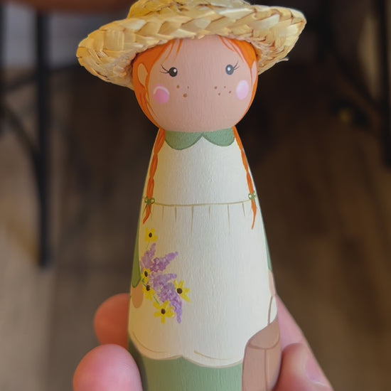 Capture the spirit of Anne of Green Gables with this charming hand-painted peg doll, inspired by L.M. Montgomery’s beloved heroine. With her iconic red braids, freckles, removable straw hat, and a wistful expression full of imagination, this handcrafted wooden figure delightfully brings Anne Shirley to life.