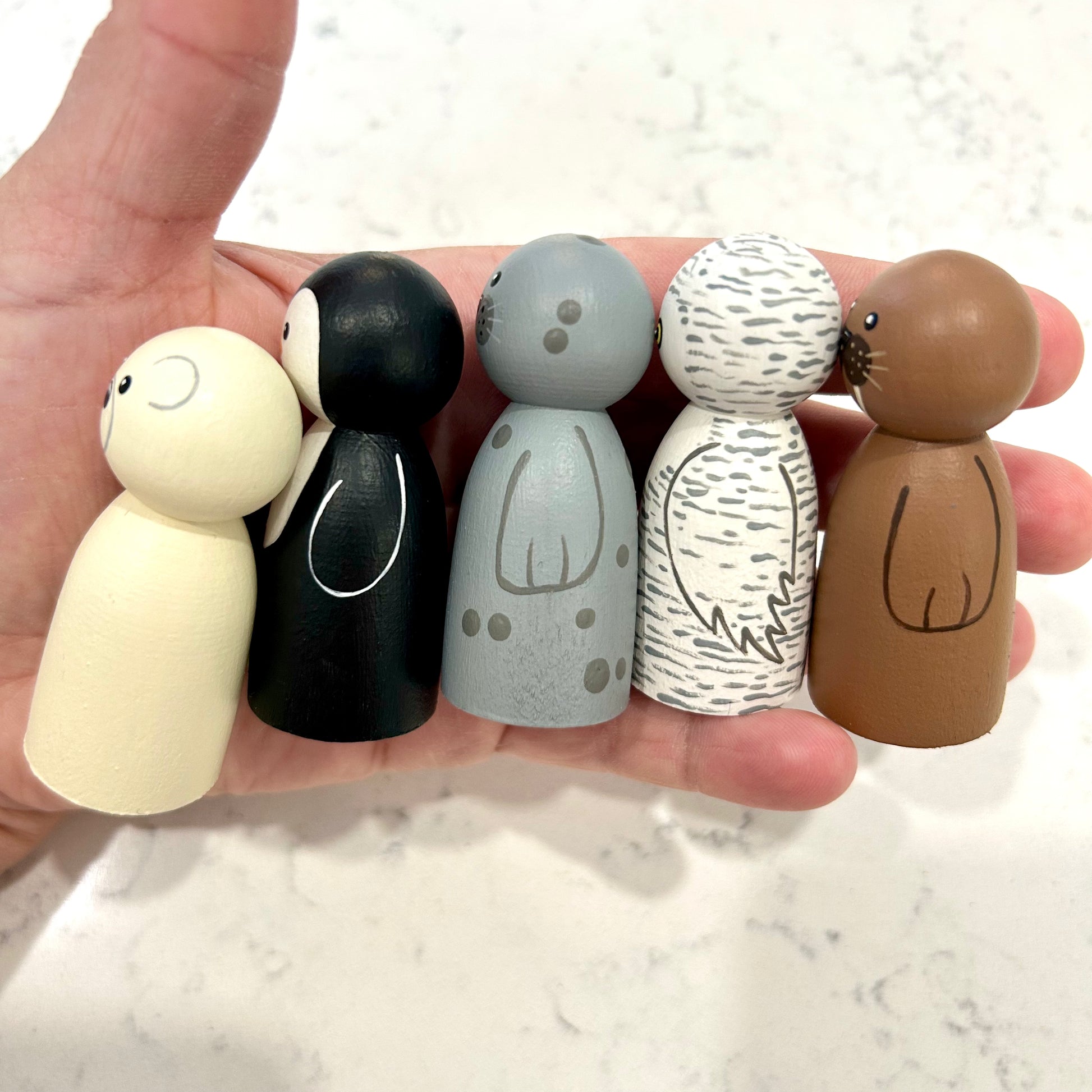 Have some frozen fun with this darling little polar animal set! This set includes five 2 1/4 inch hardwood pegs hand painted using non toxic acrylic paints and finished with a clear matte varnish for durability. You will receive a polar bear, penguin, snowy owl, seal and walrus. This set is best suited for ages 3+.