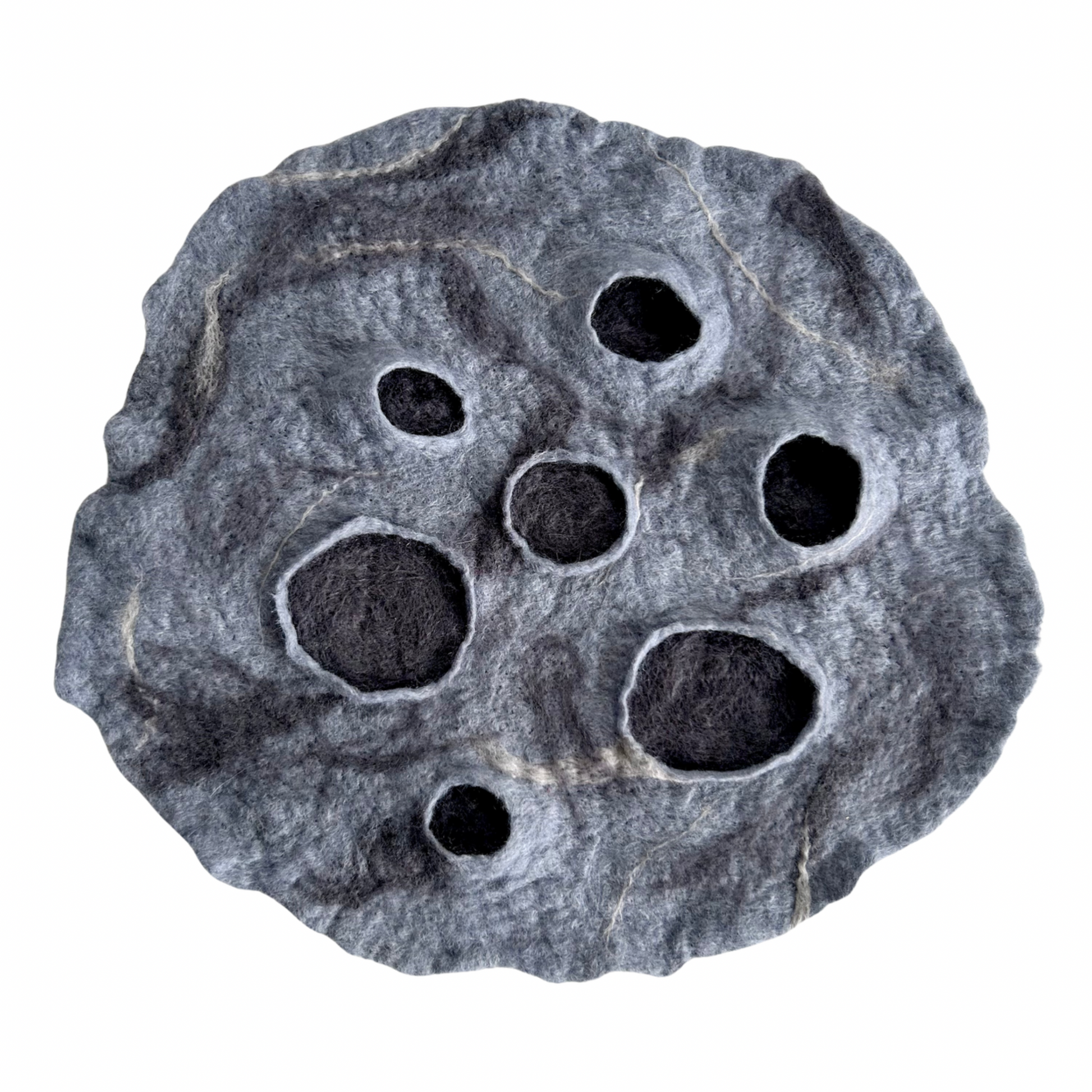 The play mat measures 10.5 inches across and features craters of varying sizes. It is hand made through the ancient art of wet felting with the use of wool, soap, water, and friction.