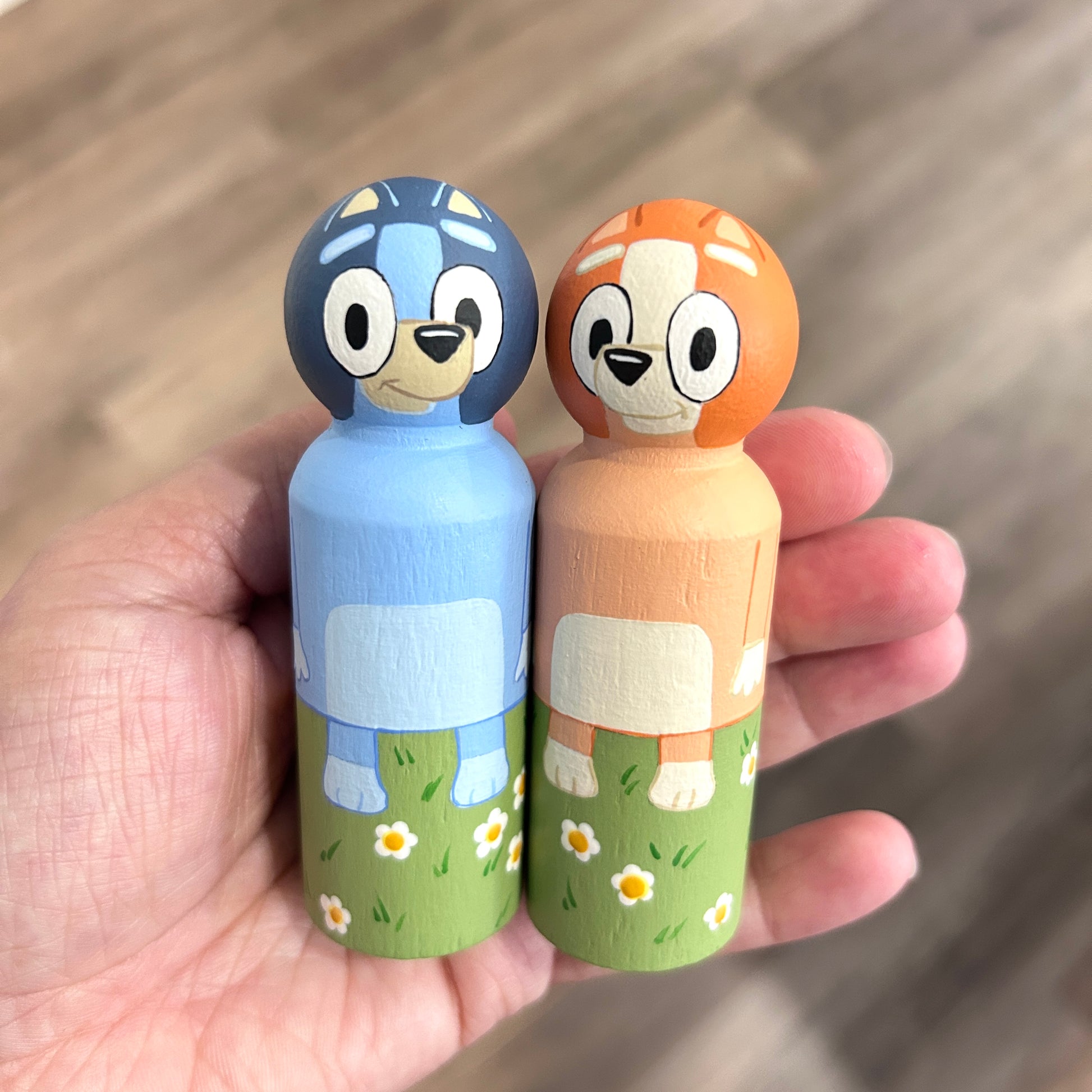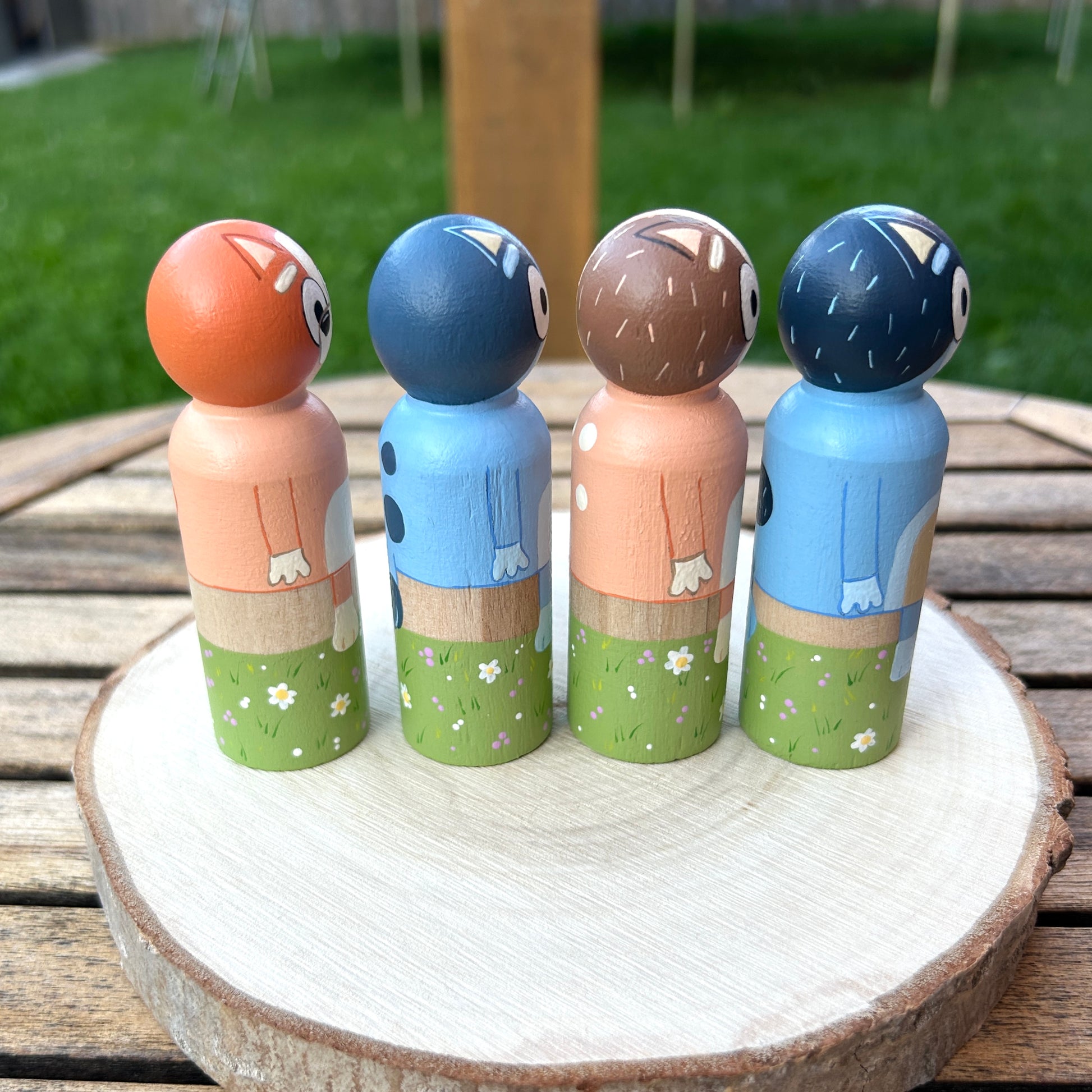 We are now offering a collection of your favourite Heeler family, for real life! Bluey is a favourite in my own household and now you can order a set or individual characters from the show. Each hardwood peg is hand painted using non toxic acrylic paints and then coated in a non toxic clear coat for durability. Pegs are 3 1/2 inches tall.