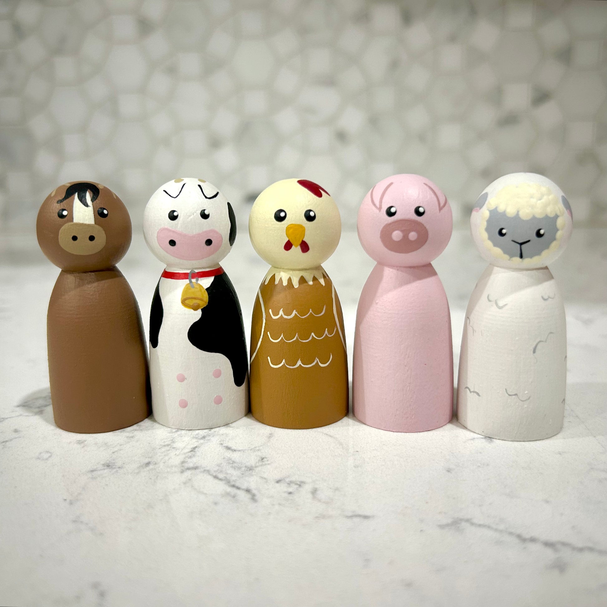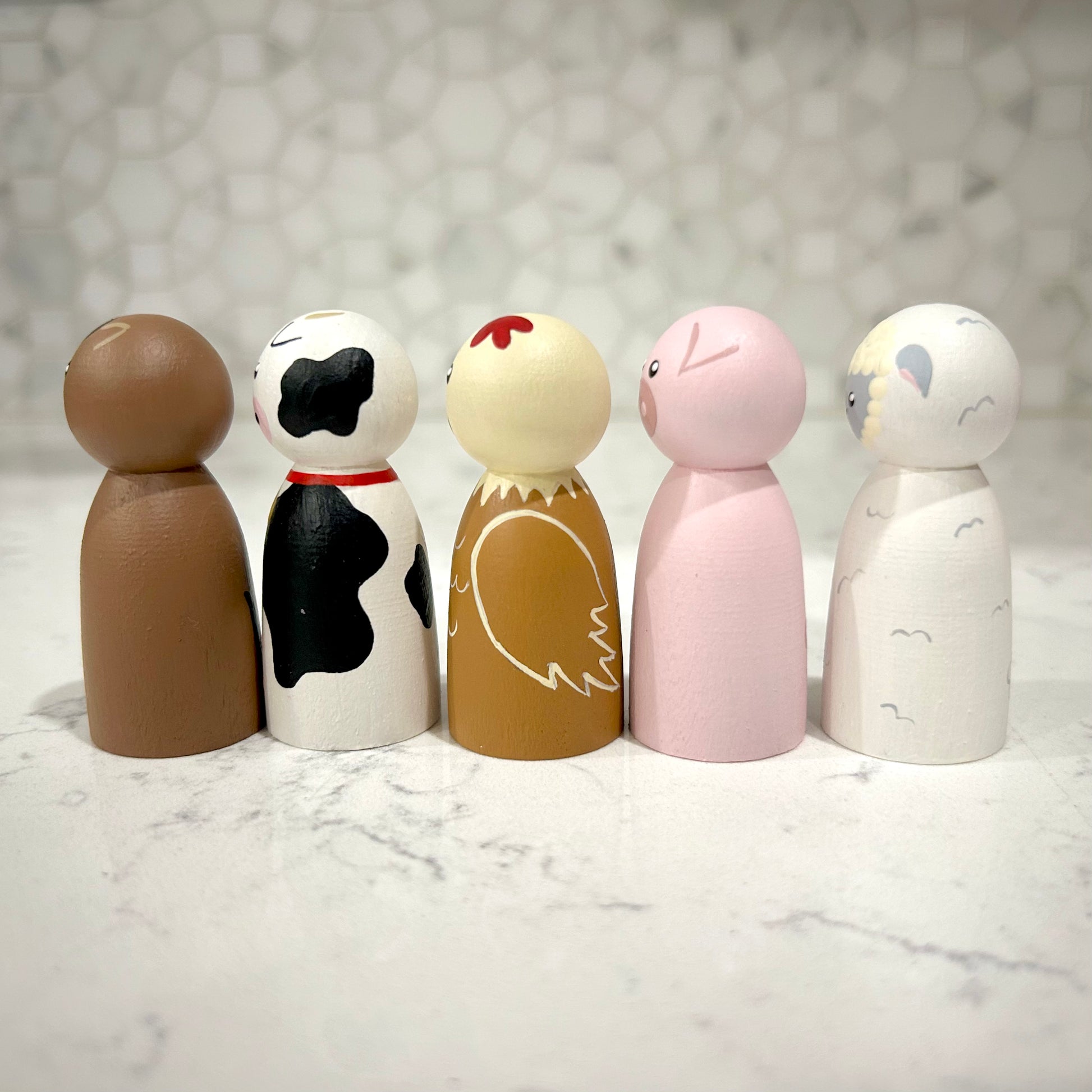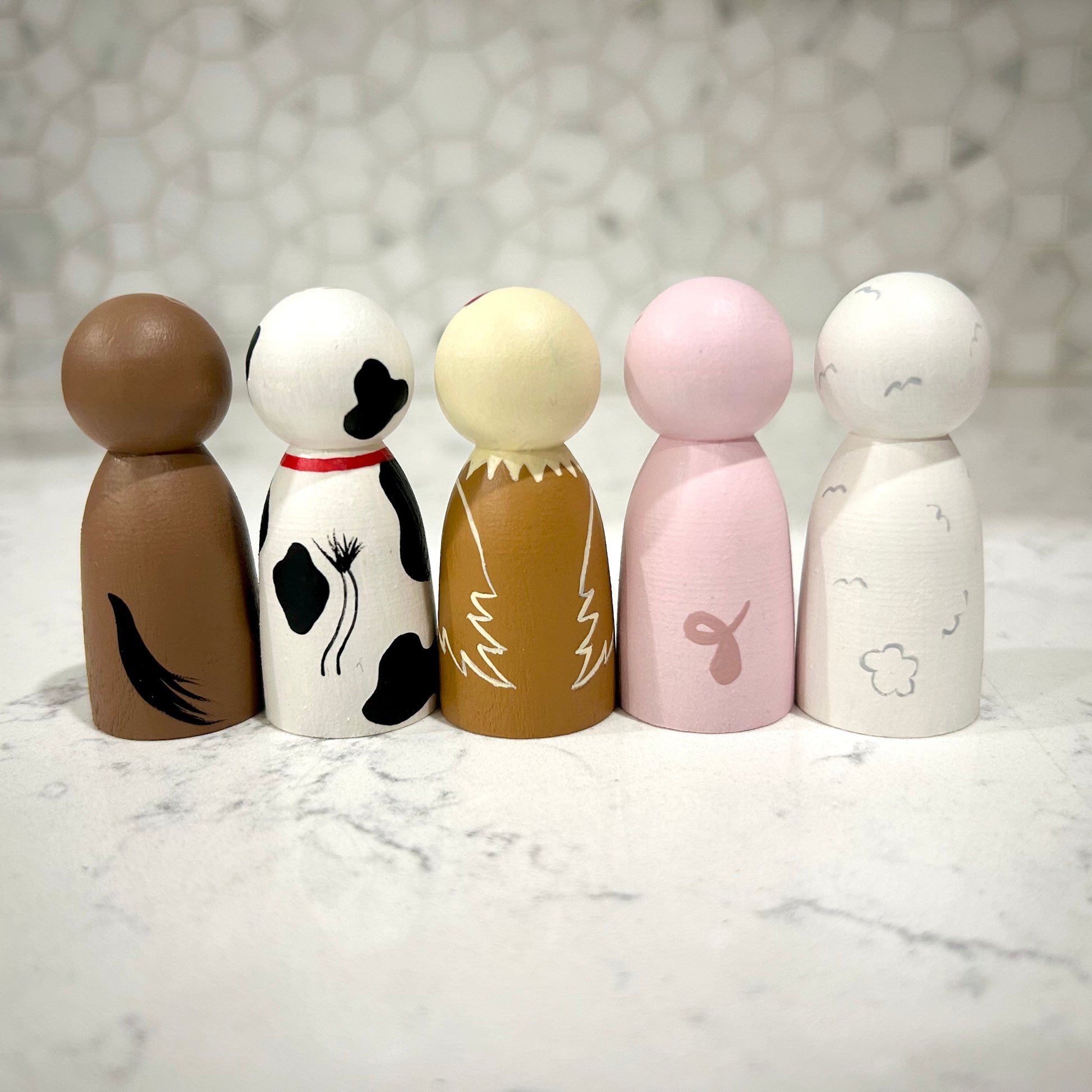 This set includes five 2 1/4 inch hardwood pegs - a cow, horse, pig, chicken and sheep. Each peg is hand painted using acrylic non toxic paints and then coated in a clear matte non toxic varnish for durability.