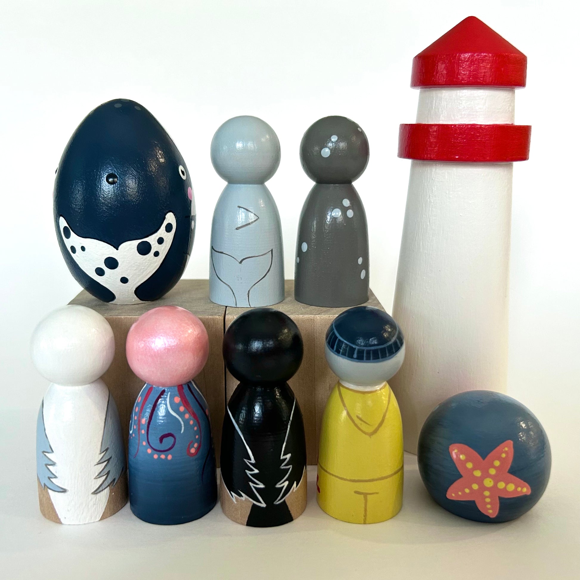 Anyone is shore to have a whale of a time with this sweet Maritime Peg Set. This set is inspired by Atlantic Canadian coastal wildlife and scenery and includes 9 pieces; a lighthouse, fisherman, seal, jellyfish, crab/starfish, humpback whale, shark, puffin and seagull.