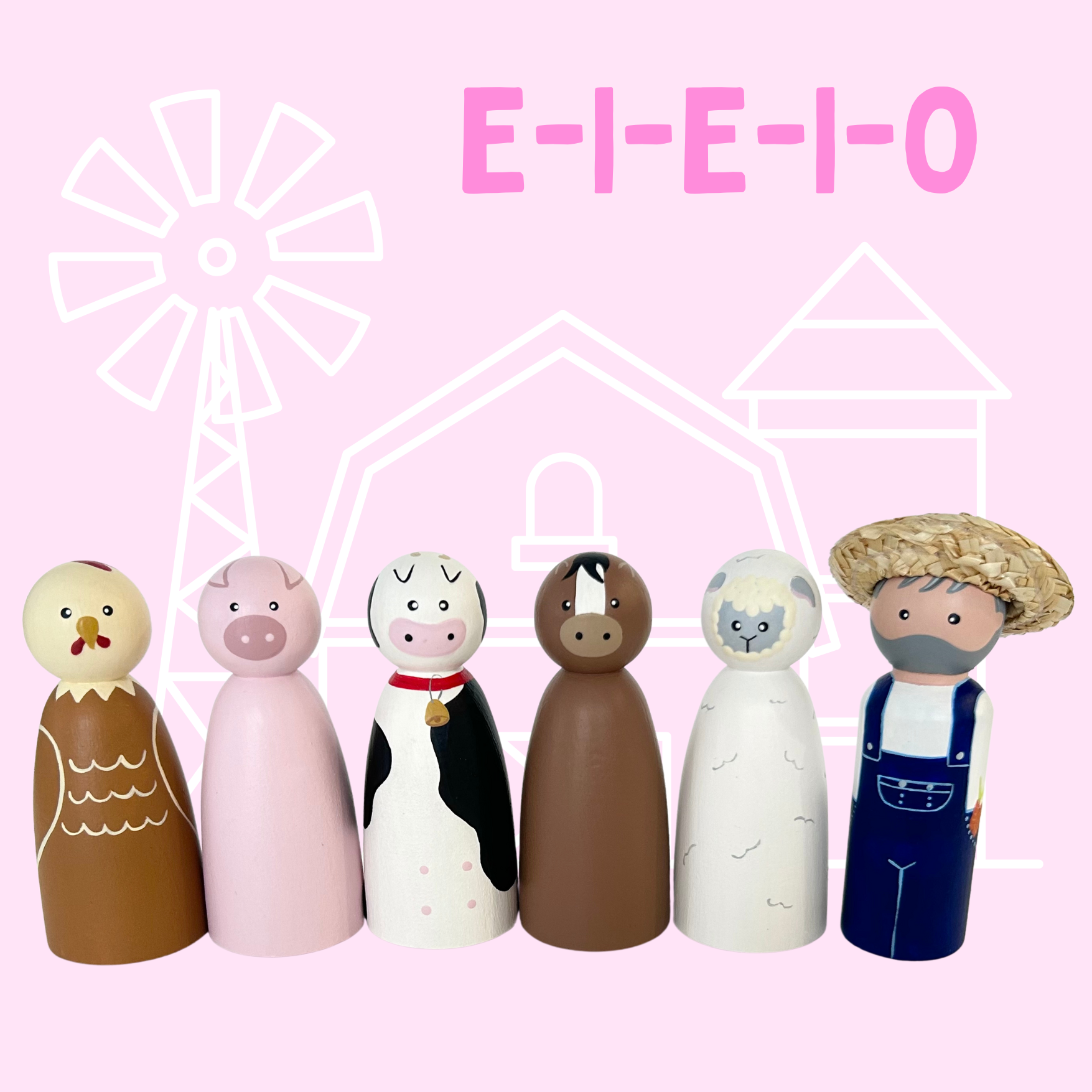 This set includes six hardwood pegs - a farmer (with hat), chicken, cow, sheep, pig, and horse. ***The five piece set comes with the farmer (with hat), cow, sheep, pig, and horse.***