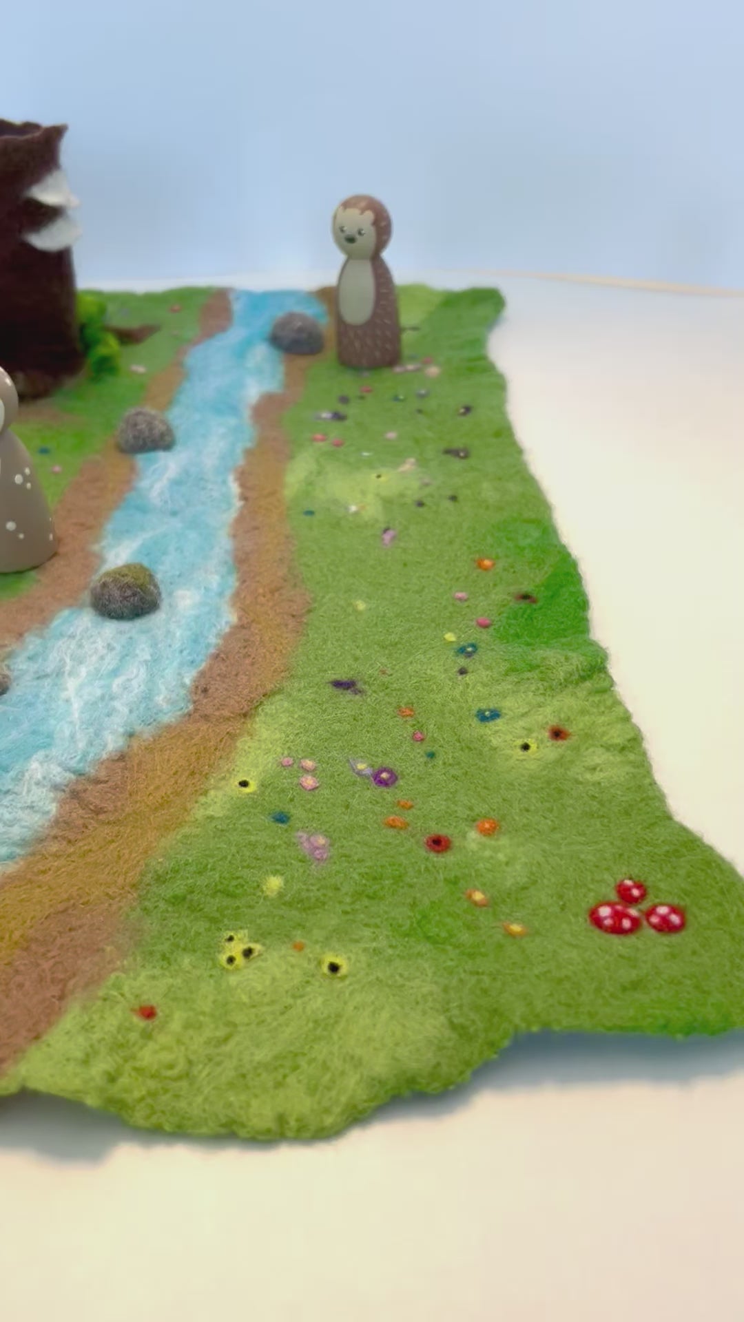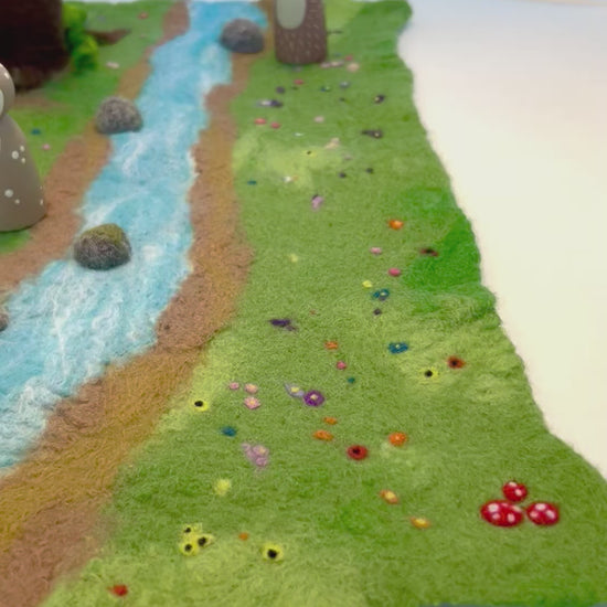 Featuring a rocky river, cave, tree stump, and grassy meadow filled with wild flowers and fungi, this mat is sure to inspire imaginative small world play and storytelling with anything from woodland creatures, fairies, gnomes, and farm animals.