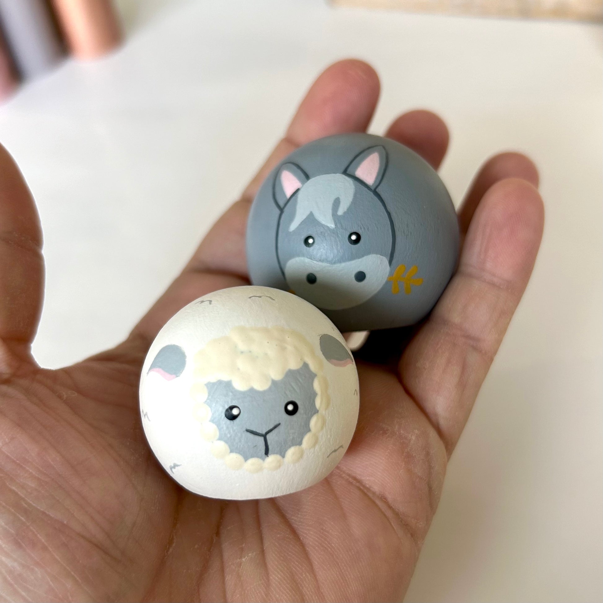 Each piece is made of hardwood and hand painted using non toxic acrylic paints, then finished using a non toxic clear matte varnish.