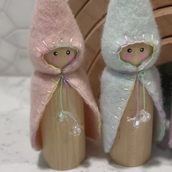 These large (3 1/2 inch) natural wooden pegs stand roughly 5 inches tall, draped in their pastel hand stitched cloaks. The cloaks are made of hand dyed wool and stitched in cotton pastel embroidery floss. Cloaks are not removable. The cheery faces are painted with non toxic water based paint.