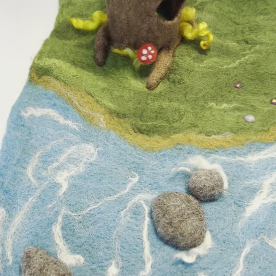 This beautiful 3D Waldorf-inspired play mat was wet felted by hand using Merino wool. Wet felting is an ancient technique for art and textile-making using friction, soap and water. Embellishments were then needle felted by hand.
