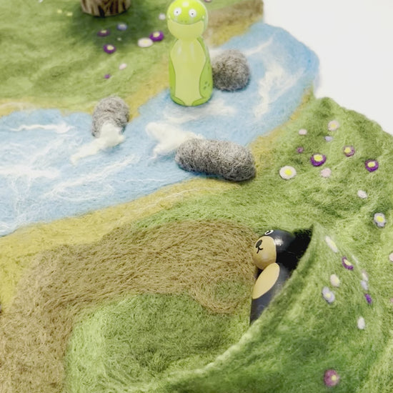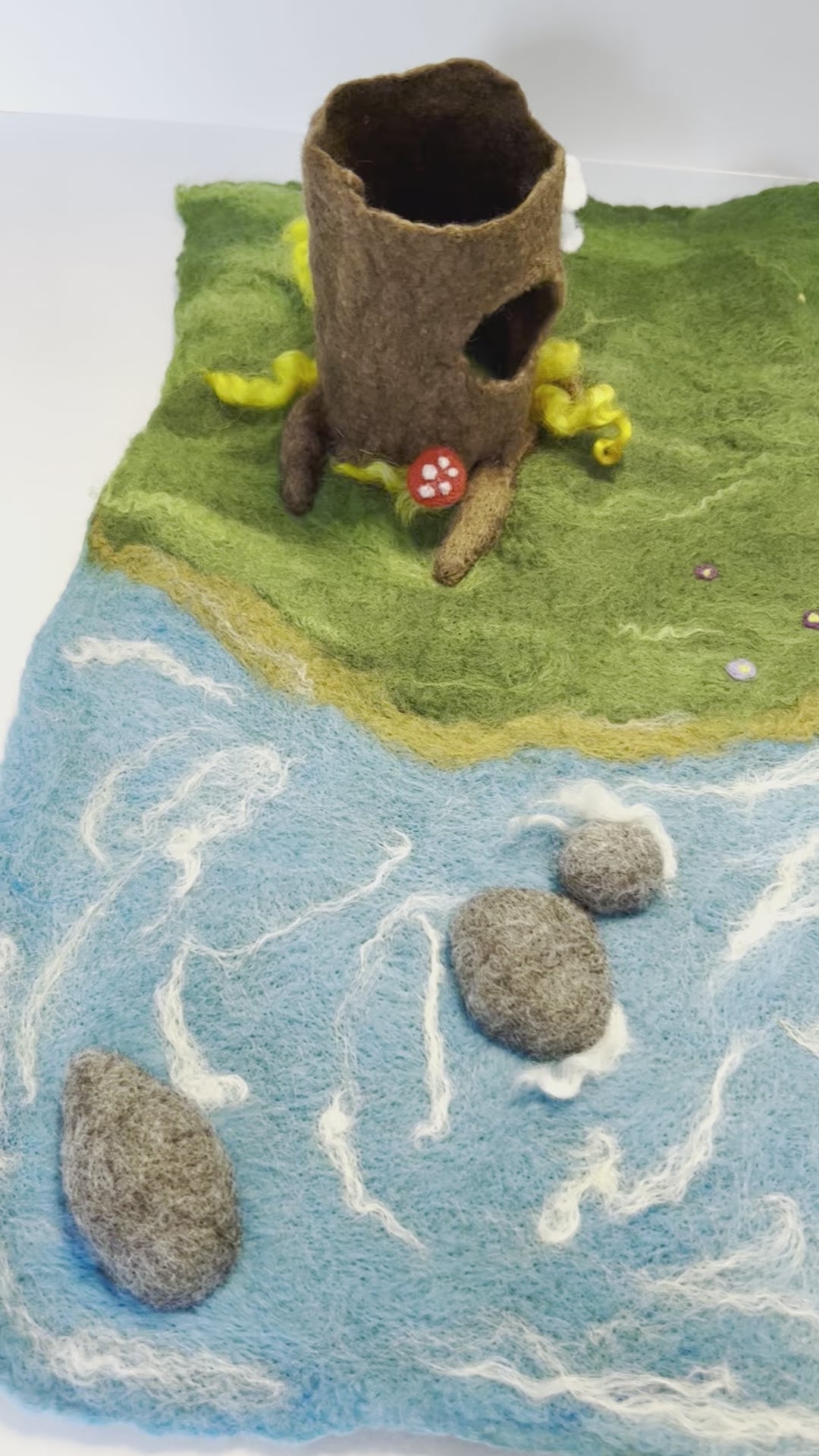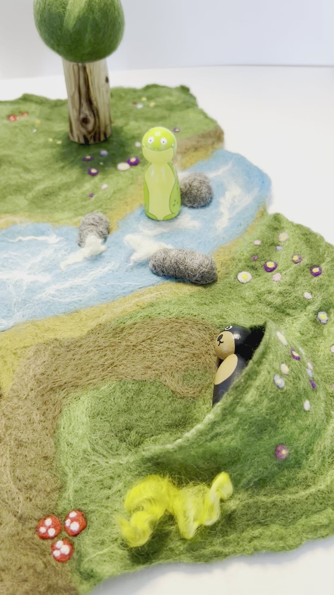 Featuring a rushing rocky river, cave, tree stump, and grassy meadow filled with wild flowers and fungi, this mat is sure to inspire imaginative small world play and storytelling with anything from woodland creatures, fairies, gnomes, and farm animals.